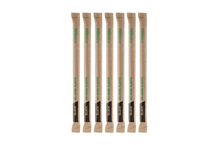 Χάρτινα καλαμάκια με πιστοποίηση FSC®, σπαστά, μαύρα διαμέτρου 0.6εκ. και μήκος 21 εκ. χωρίς εσωτερική πλαστική επίστρωση. Συσκευασμένα ένα προς ένα σε χάρτινο kraft περιτύλιγμα TESSERA bio products®.