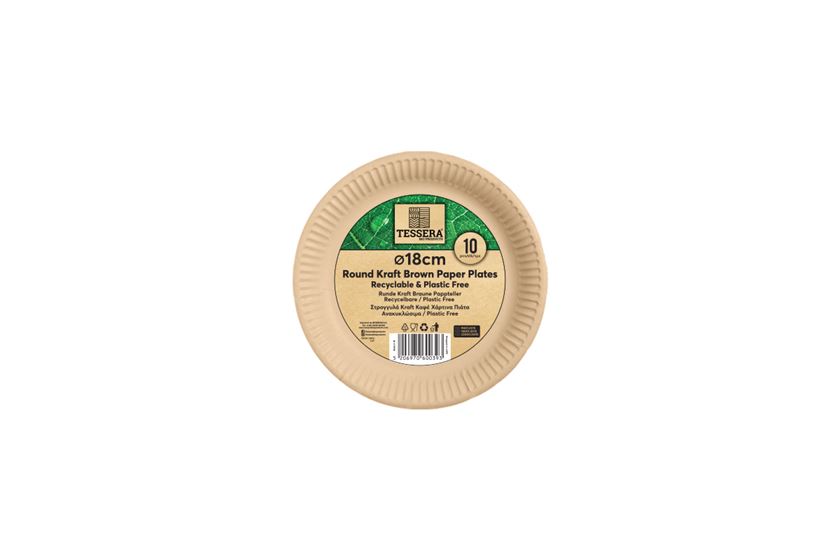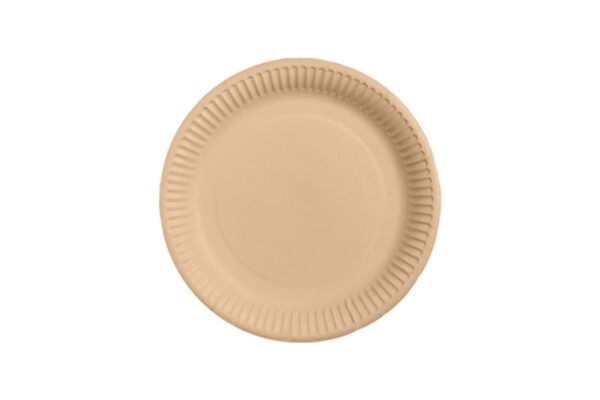 Στρογγυλό πιάτο Ø18 cm, από χαρτί, σε καφέ χρώμα, ανακυκλώσιμο, χωρίς πλαστική επίστρωση.